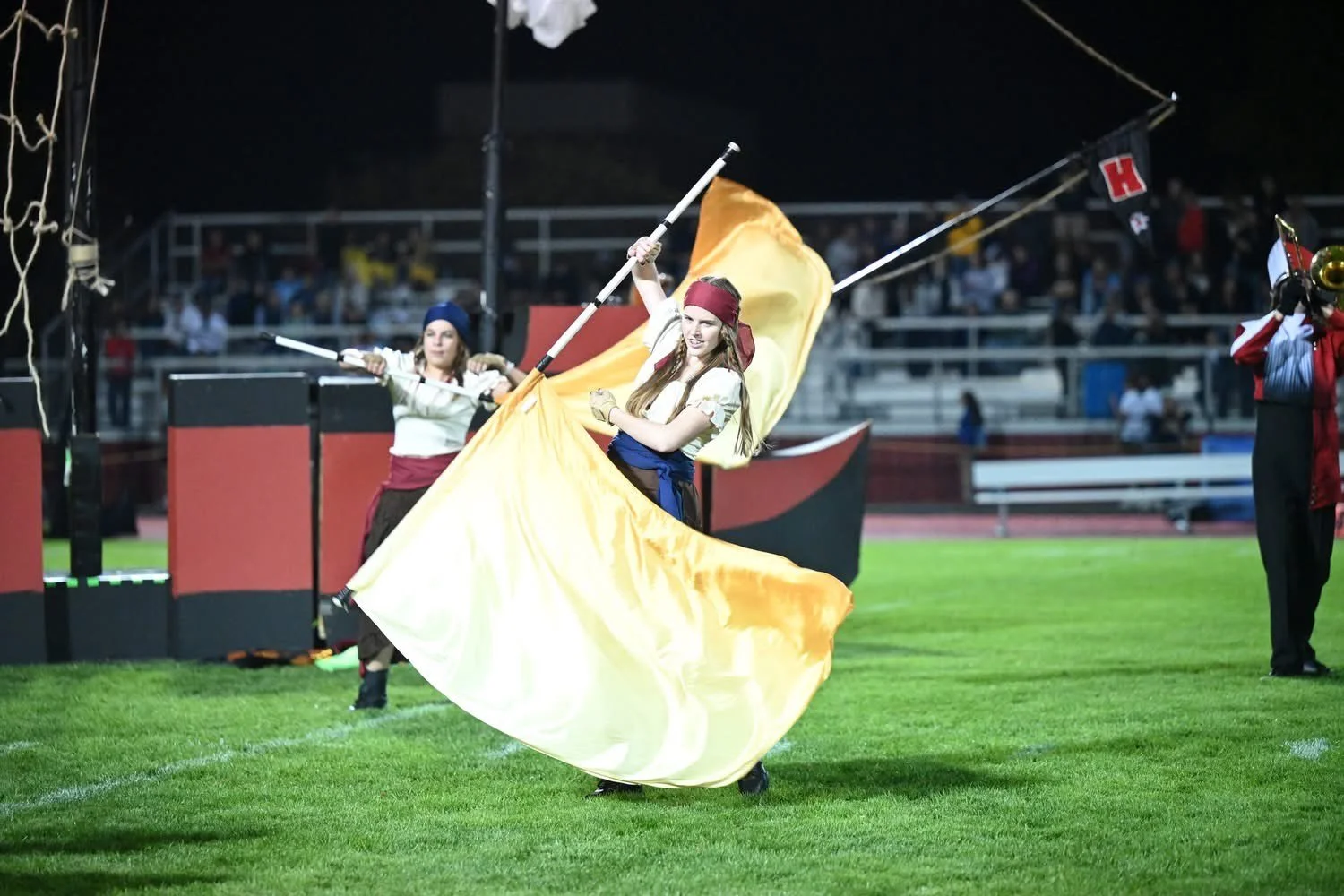 I asked freshman guard member Olivia Wilhelm to give me a little bit of insight as to what the performance, “A Pirate’s Adventure” was about and how the guard contributed to the overall story. Wilhelm explained that the entire show follows the guard as they portray pirates who get lost at sea and have to battle monsters in order to get their gold. The first movement portrays the guard members as pirates who are fighting over which way to go and end up losing their items as they go into battle. The second movement portrays the guard as hopeless and lost as they become stranded at sea. The third and final movement shows the guard finding their direction, but not without challenge. The members have to fight off monsters but finally end with their treasure. The guard is a crucial part of conveying the story and they have done an incredible job this season!