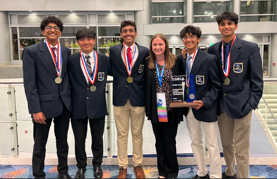 Rohit Washikar and Adit Bhootra received two medals and a 3rd place DECA glass, or trophy, in the Innovation Plan Project. Alex Yan and Raj Ramanathan received two medals and were recognized as top 10 finalists in the Entrepreneurship Team Event and finished in 5th place overall. Rohan Nuthi received three medals and was a top 10 finalist in Retail Merchandising Individual Series and finished 4th overall. Jishnu Jayesh received a finalist medal in the Principles of Business Management and Administration Event and was in the top 20 overall. Congratulations to the hard work of these students as well as every other competitor!